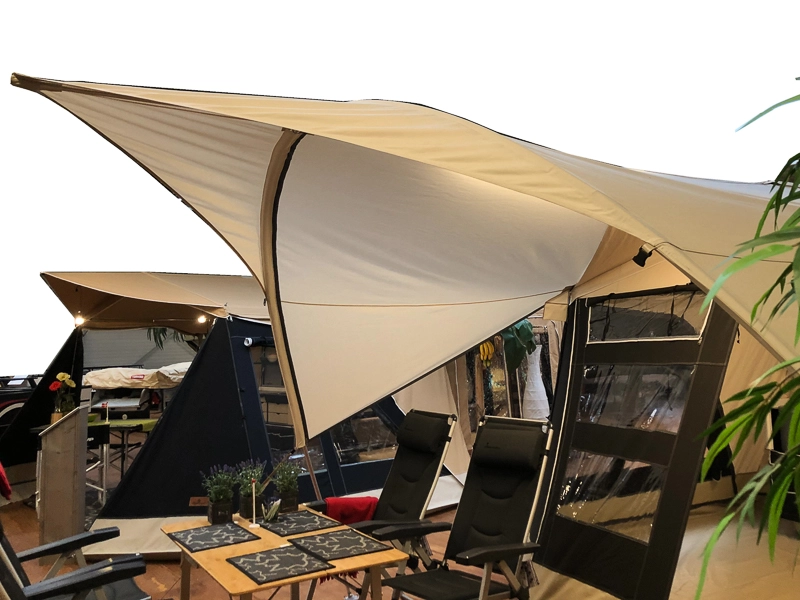 Boogluifel met windschermen. De luifel kan aan je voortent gemaakt worden d.m.v. een adapter of in plaats van je voortent kun je hem aanritsen aan de wagentent. Past op de modellen vanaf 2007.