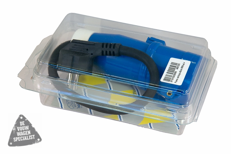 Verloopkabel Normale stekker en 40cm kabel met CEE uitgang (Franse verloop). Deze verloopkabel gebruik je als je de CEE kabel thuis wil gebruiken in een normaal stopcontact of op camping waar geen CEE stopcontact is.