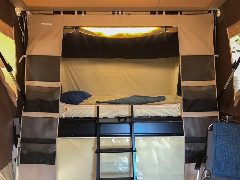 Opbergschort die aan bedzijde aan de wagentent komt te hangen. Kleur beige.
